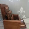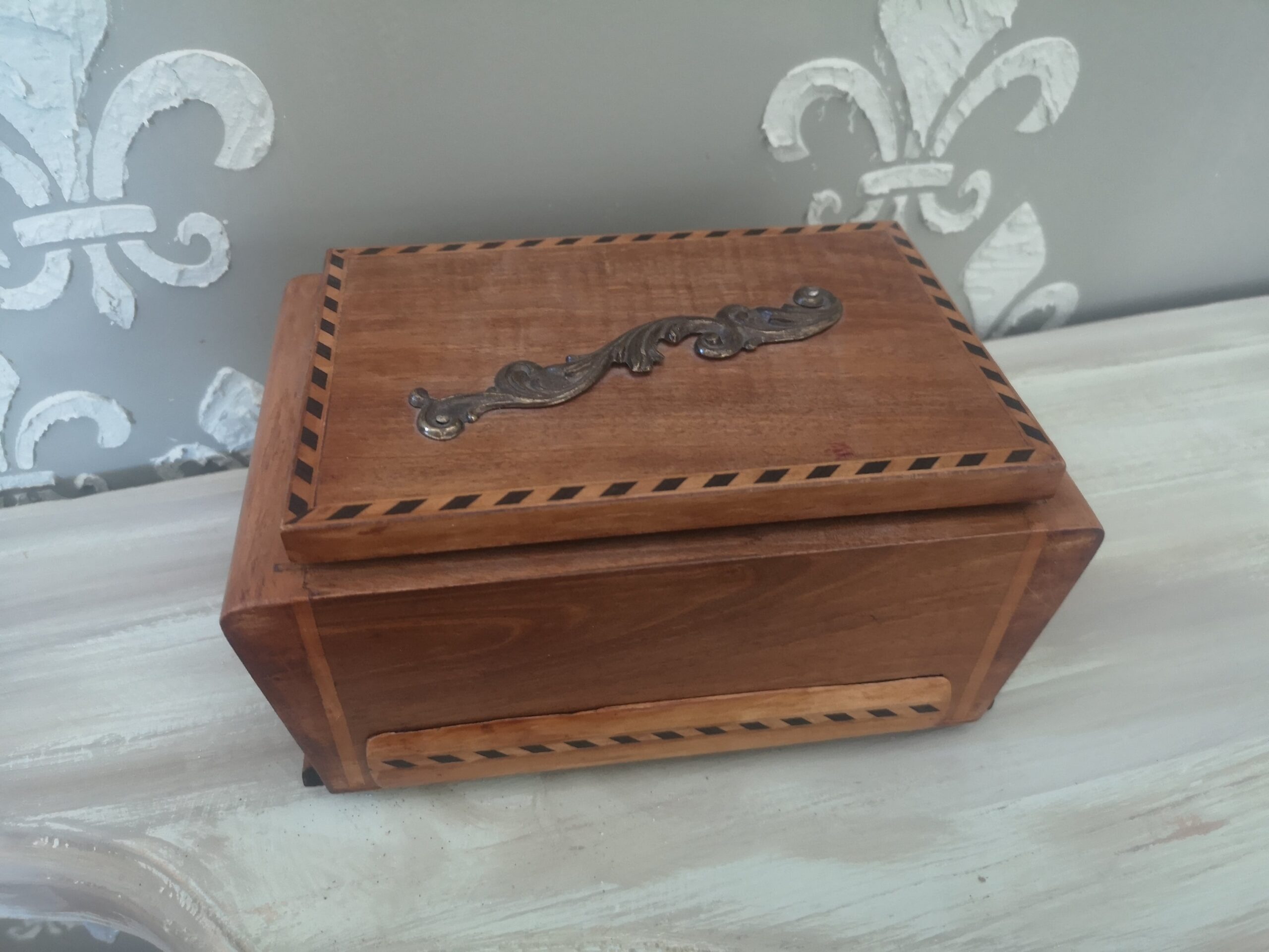 Antico portasigarette da tavolo in legno, dotato di cassettino per contenere i fiammiferi, con cornice ad intarsio e bel fregio metallico applicato sul coperchio