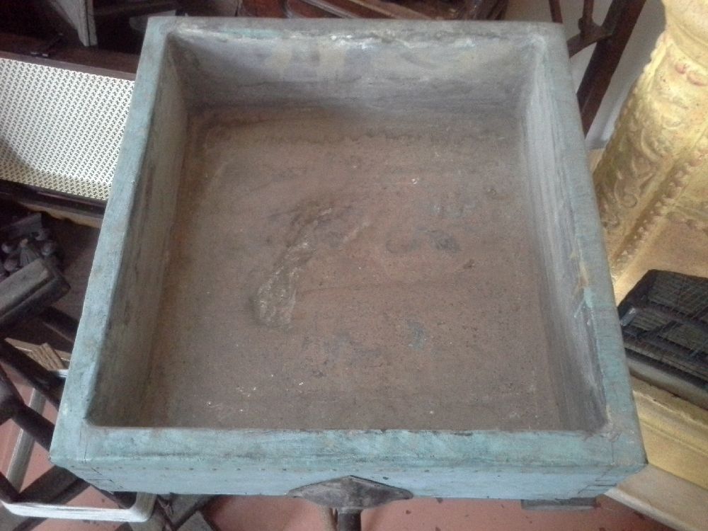 Lavabo con struttura in legno. Rivestito con lamiera. Esclusa base.